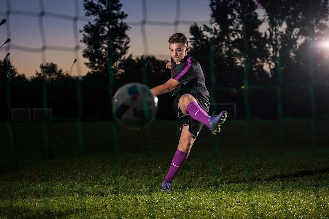 Sportowa sesja plenerowa zaczęłą się kiedy słońce było tuż nad horyzontem, co z jednej strony miało mi ułatwić zarządzanie światłem dla uzyskania kontrastowego efektu bez photoshopa, ale z drugiej strony, planowalem też kilka dynamicznych ujęć z widocznym tłem a do tego fajnie mieć nieco światła zastanego. Zaczęła się nierówna walka z czasem przed nadejściem całkowitej ciemności: chłopcy trenują, jednym okiem oceniam kadr, piłki świszczą nad głową.. drugim okiem spoglądam na odległość ode mnie do lampy ( myślę: zdążę ją złapać czy nie?) Ziuuu.. piłka przelatuje tuż obok lampy, strużka potu cieknie po skroni a z ust moich słuchać,: nie, nie, wcale się nie wystraszyłem, wiedziałem że strzelisz na bezpieczną odległość ośmiu centymetrów od statywu 🙂 Zaczęliśmy od kadrów statycznych ale po krótkim czasie przerzyciliśmy się na ujęcia w akcji. Moim celem było uchwycenie dynamiki tuż po kopnięciu piłki. Najlepiej z piłką w kadrze. Najbardziej do tego ujęcia pasowała pozycja zza bramki. Tam też się ustawiłem po uprzednim przearanżowaniu ustawień statywów z lampami. Zaczęły się strały na bramkę, co chwilę wycierałem obiektyw i twarz z błota (było po deszczu!) które kontynuowało swoją podróż za każdym razem gdy piłka zatrzymywała się na siatce. No nic, takie drobiazgi nie są po to aby nas zniechęcać, ale po to by sprawdzać naszą determinację. Ja chciałem mieć to ujęcie. I je zdobyłem. Prędkość, skupienie, precyzja. Takie zdjęcie sobie wyobrażałem! Co prawda moja misja była już spełniona a kilka chwil później wróciły chmury, zaczęła się mżawka i zrobiło się ciemno, postanowiłem złapać jeszcze jeden kadr. Obaj piłkarze w blasku jupiterów. Znaczy się lamp 430EX 🙂 Za tło posłużyła nam bramka za którą chowałem się jeszcze parę chwil temu. Nieskromnie stwierdzam że równie dobre jak poprzednie: