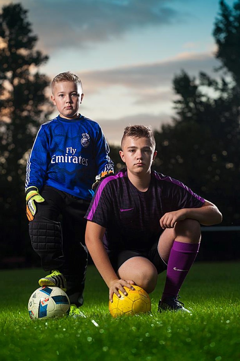 Kuba i Mateusz to miłośnicy piłki nożnej. Kiedy postanowiliśmy zrobić kilka zdjęć w plenerze, motyw przewodni był oczywisty. Sportowe stroje, piłka i boisko. Boisko? No tak, przecież każdy wie, że sierpniowe popołudnie to najlepszy czas na zdjęcia na powietrzu! Chyba że w umówionym dniu będzie mocno padać. I w następnym. I w kolejnym też 🙂